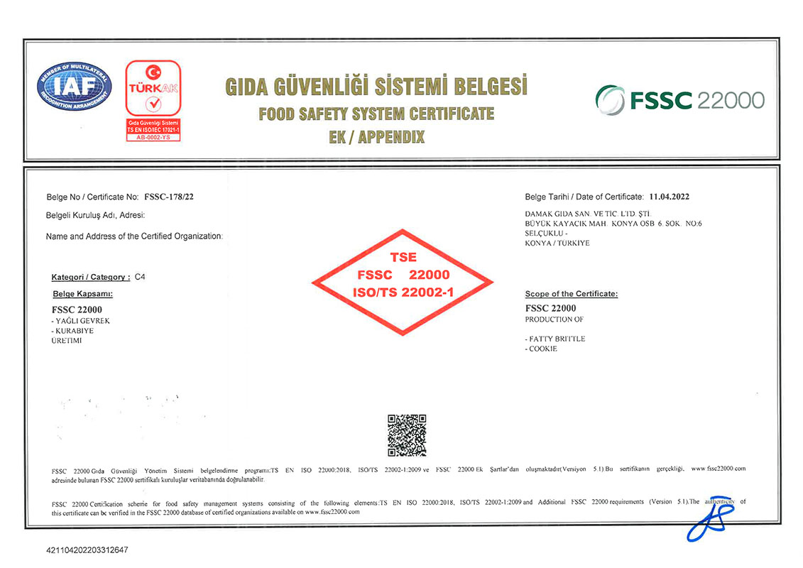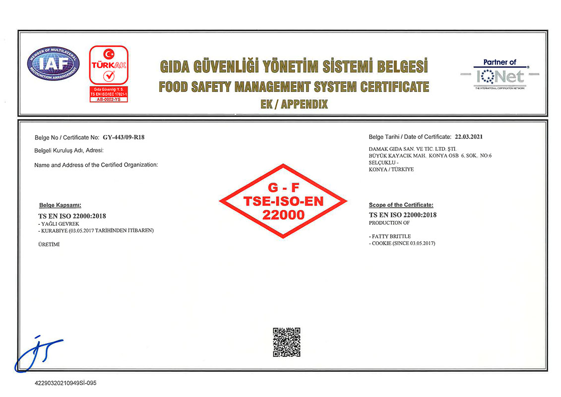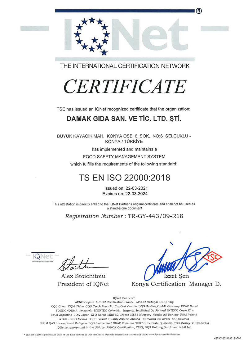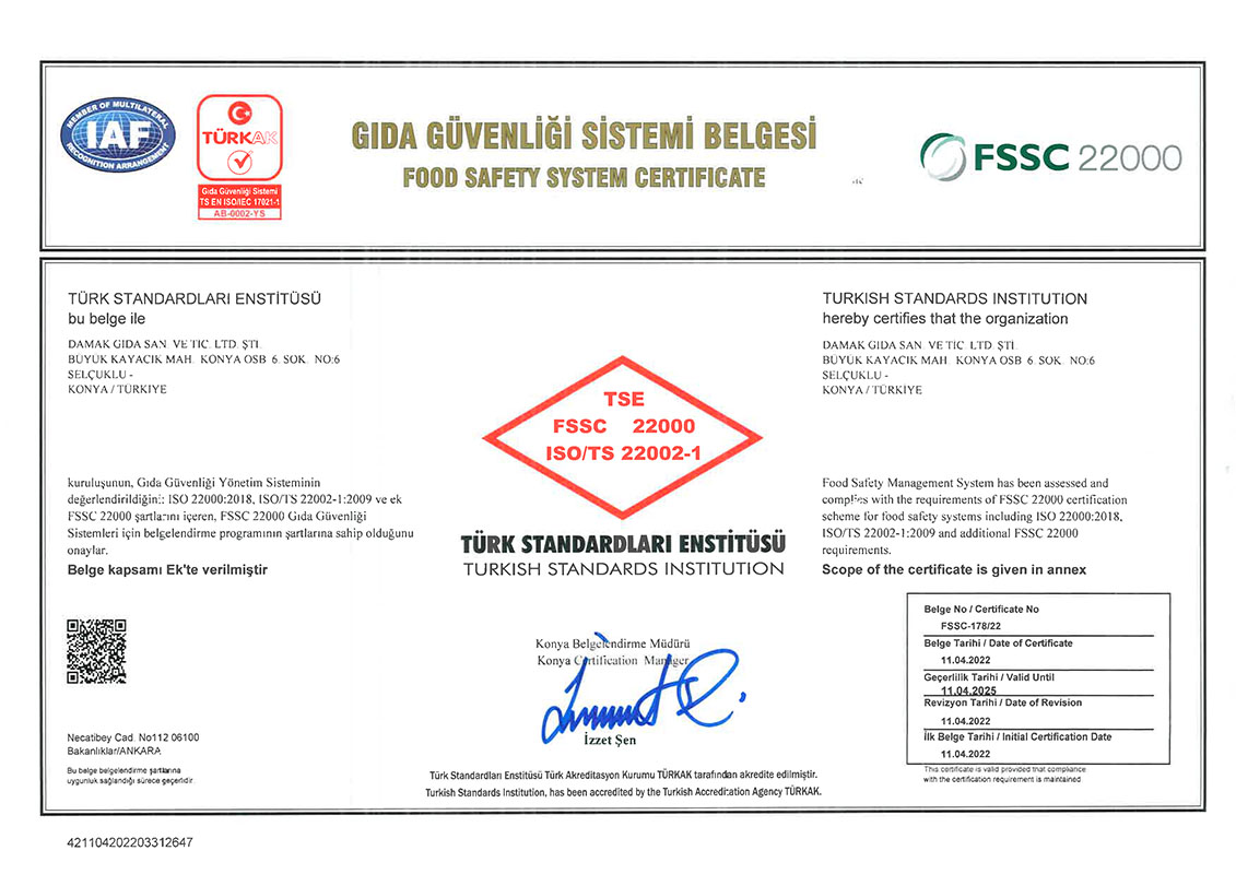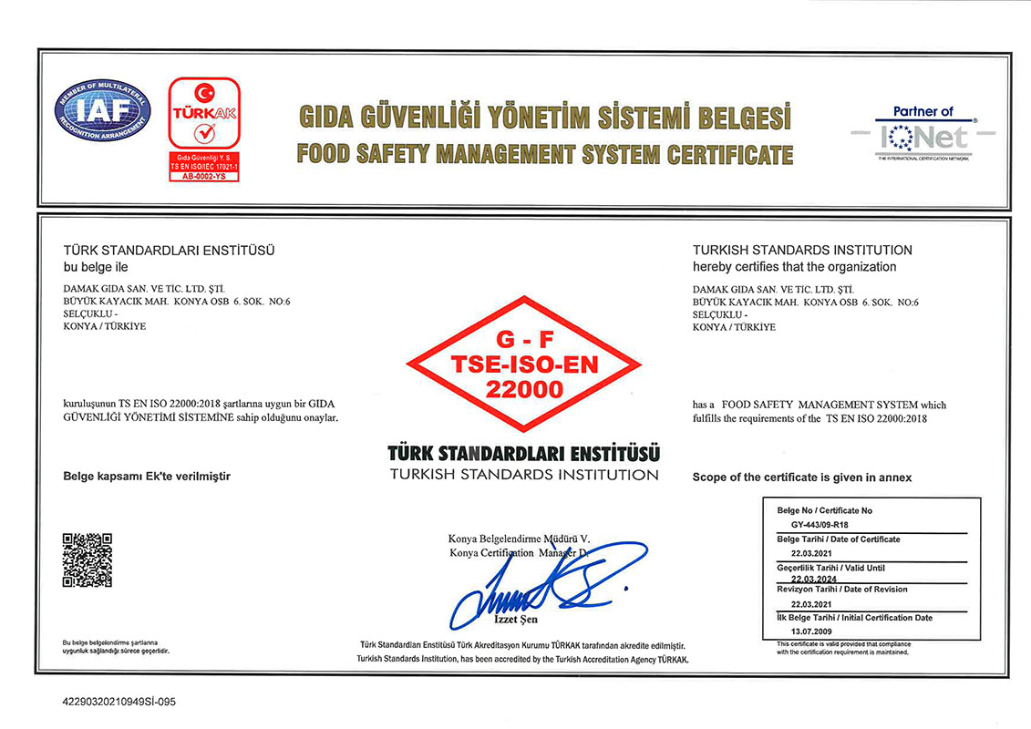 Our sensitive policy on quality and product safety, which is the most important axis of food production, has been certified with the Food Safety System Certification 22000 (FSSC 22000), TSE 9001-2015 Quality Management System, and TSE 22000-2018 Food Safety Management System. We are constantly working on new certification in this area.