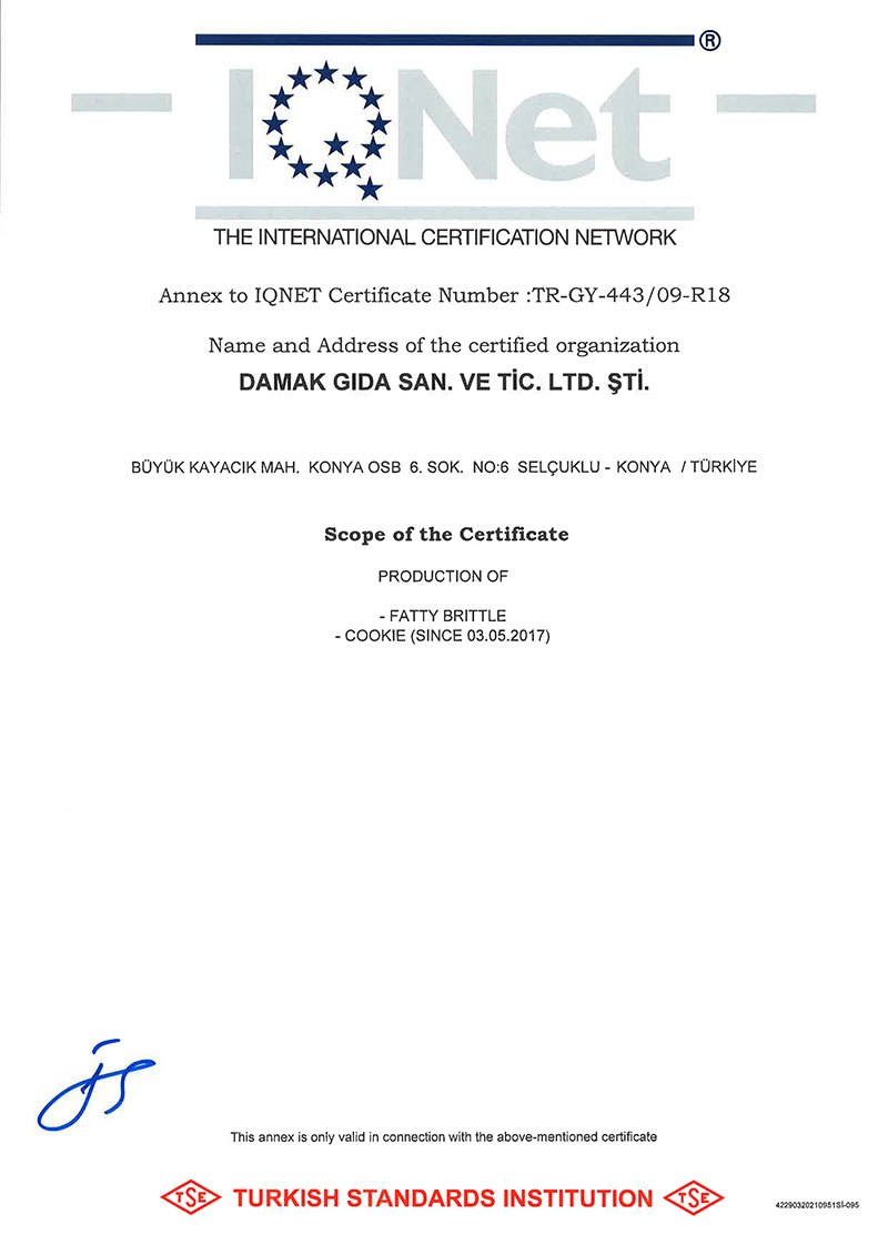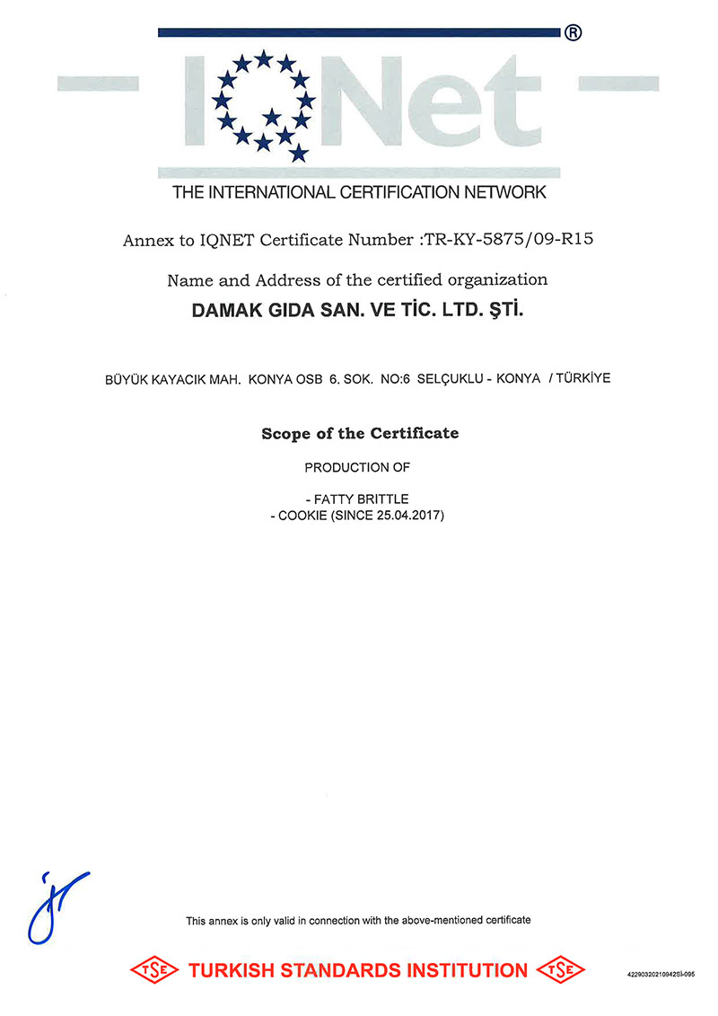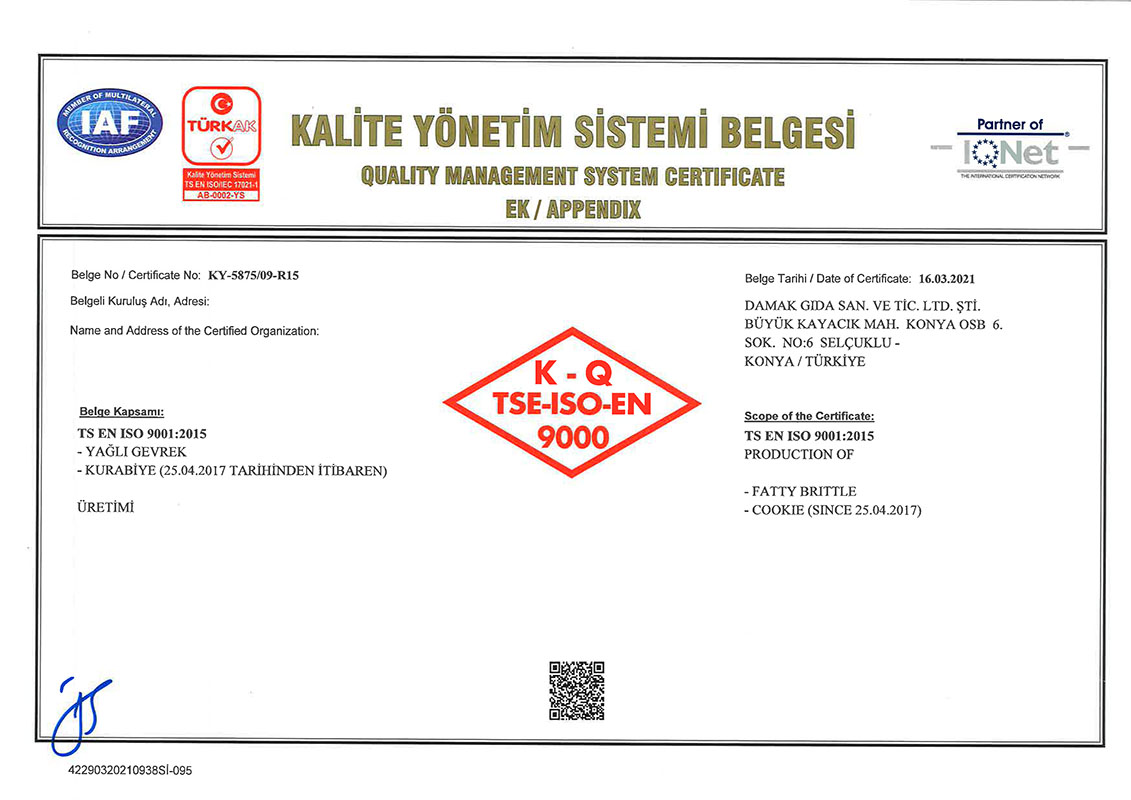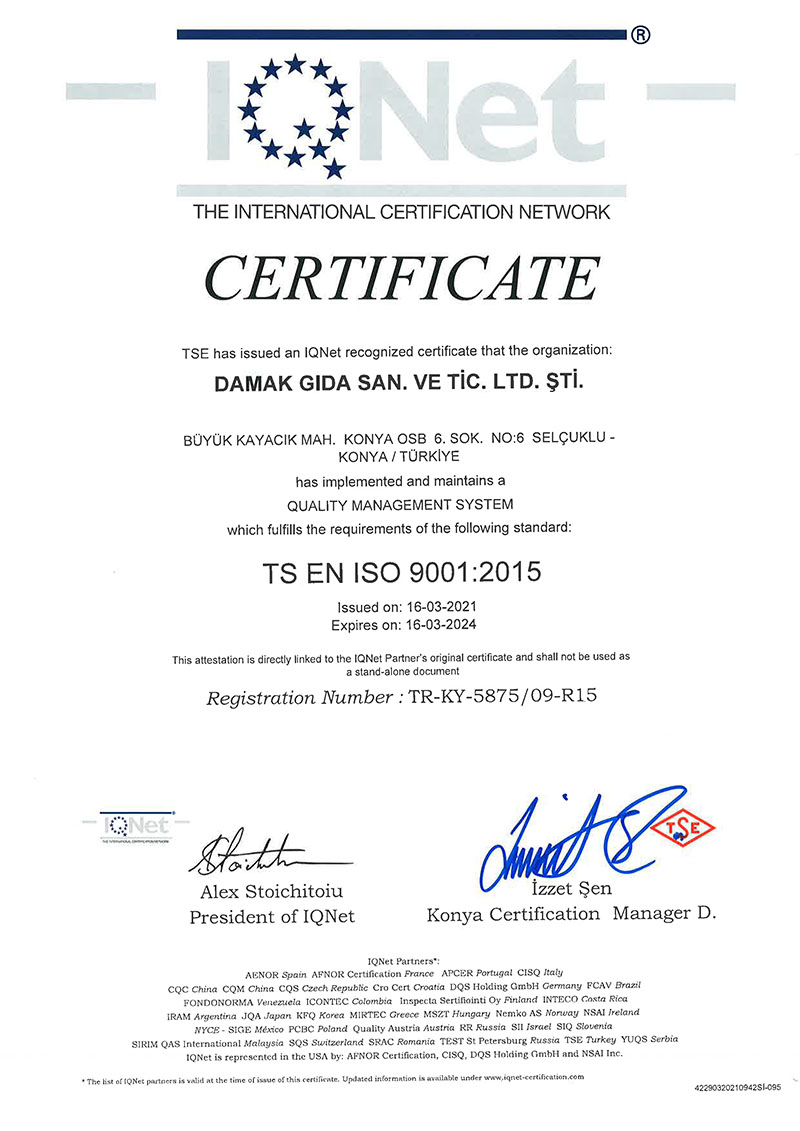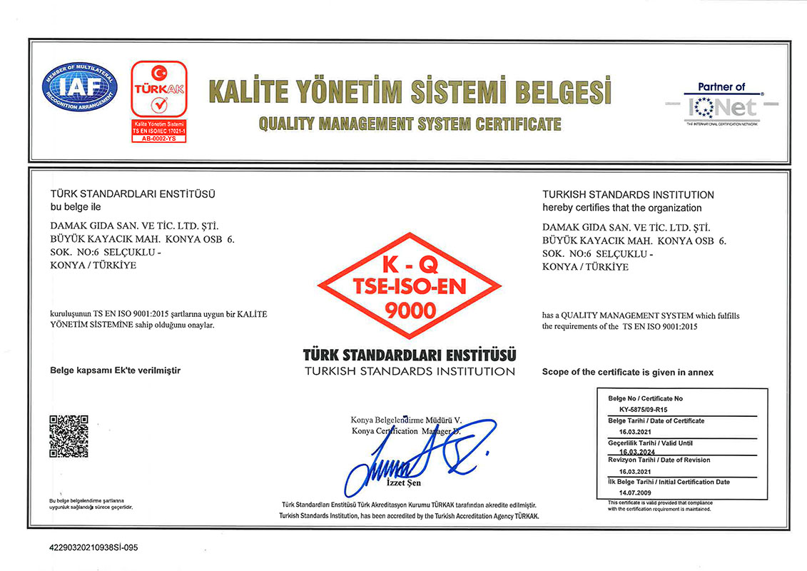 Our sensitive policy on quality and product safety, which is the most important axis of food production, has been certified with the Food Safety System Certification 22000 (FSSC 22000), TSE 9001-2015 Quality Management System, and TSE 22000-2018 Food Safety Management System. We are constantly working on new certification in this area.
